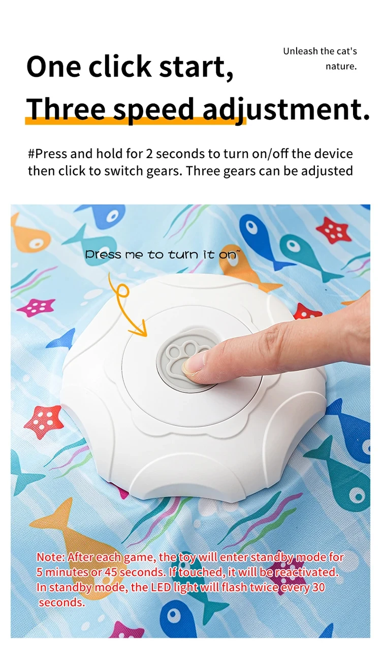 O CatHunt™ possui 3 modos de velocidade (lento, rápido e interativo), ajustáveis com apenas um botão, permitindo adaptar o ritmo à energia do seu gato.